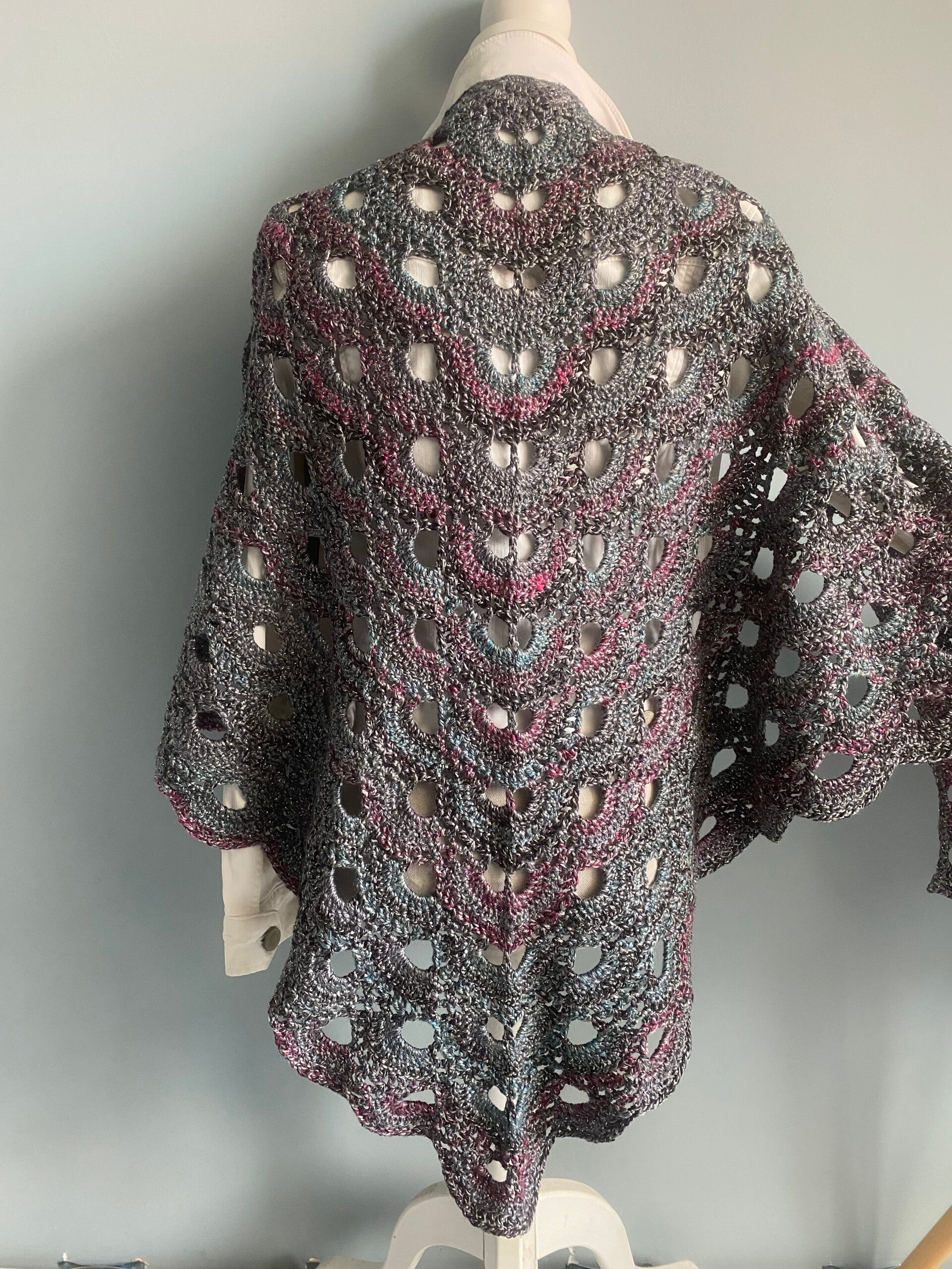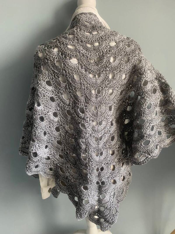 Shawl Arya is gehaakt van een soepel acryl garen waar een nylon glansdraad doorheen is verwerkt. Deze draad ziet er uit als metaaldraad.